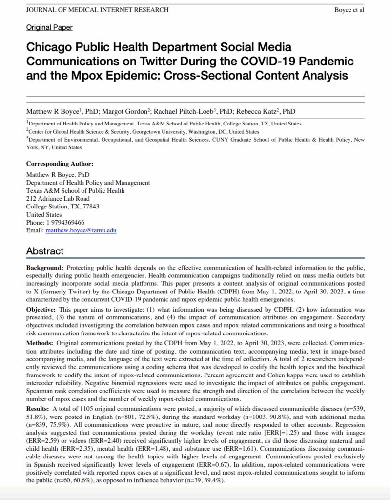 Boyce MR, Gordon M, Piltch-Loeb R, Katz R. Chicago Public Health Department Social Media Communications on Twitter During the COVID-19 Pandemic and the Mpox Epidemic: Cross-Sectional Content Analysis. Journal of Medical Internet Research. July 18, 2025.
